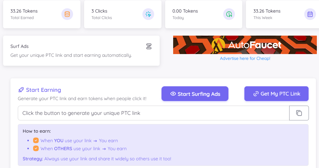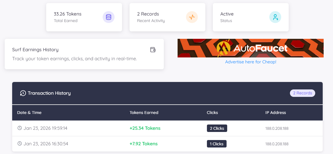 The ZerAds Surfing PTC System is a dynamic add-on for Viefaucet script that allows users to earn tokens by viewing Paid-To-Click (PTC) advertisements and track their earnings in real-time.